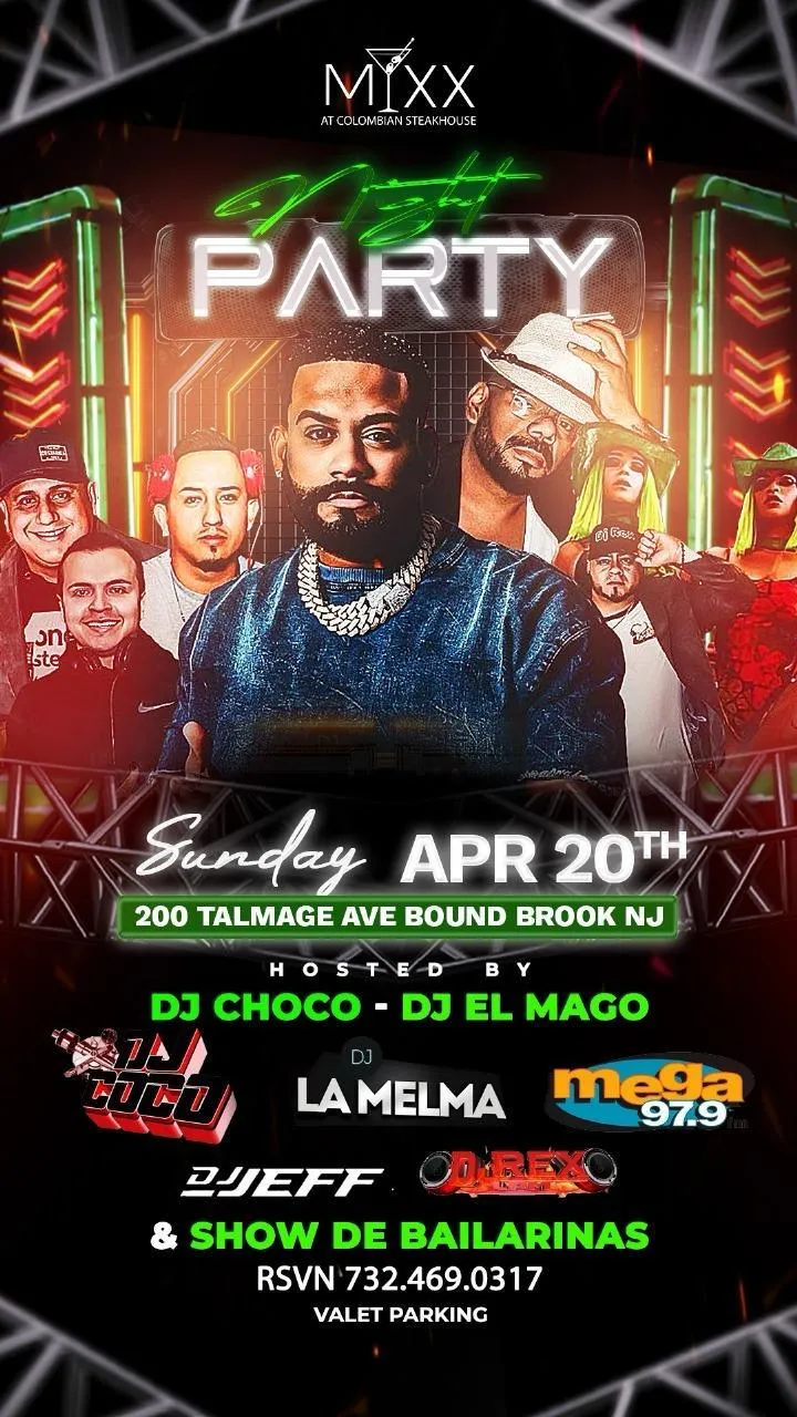 On Sunday, April 20, MIXX Colombian Restaurant brings you an all-star DJ lineup for an unforgettable day-to-night event. Join DJ Rex, DJ Choco, DJ El Mago, DJ CoCo, DJ Melma, DJ Jeff, and Mega 97.9 for a high-energy experience you won’t want to miss.