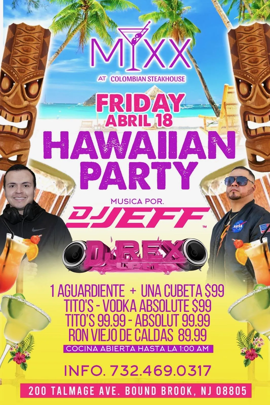 This Friday, April 18, DJ Rex and DJ Jeff take over MIXX Colombian Restaurant in Bound Brook, NJ for a high-energy Hawaiian Party.