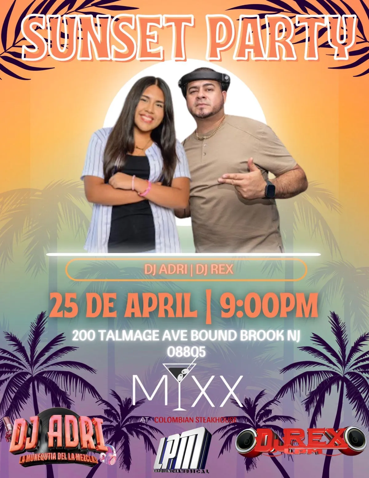 On Friday, April 25 at 9:00 PM, MIXX Colombian Restaurant invites you to the Sunset Party, featuring DJ Rex, DJ Adri, and La Potencia Musical.